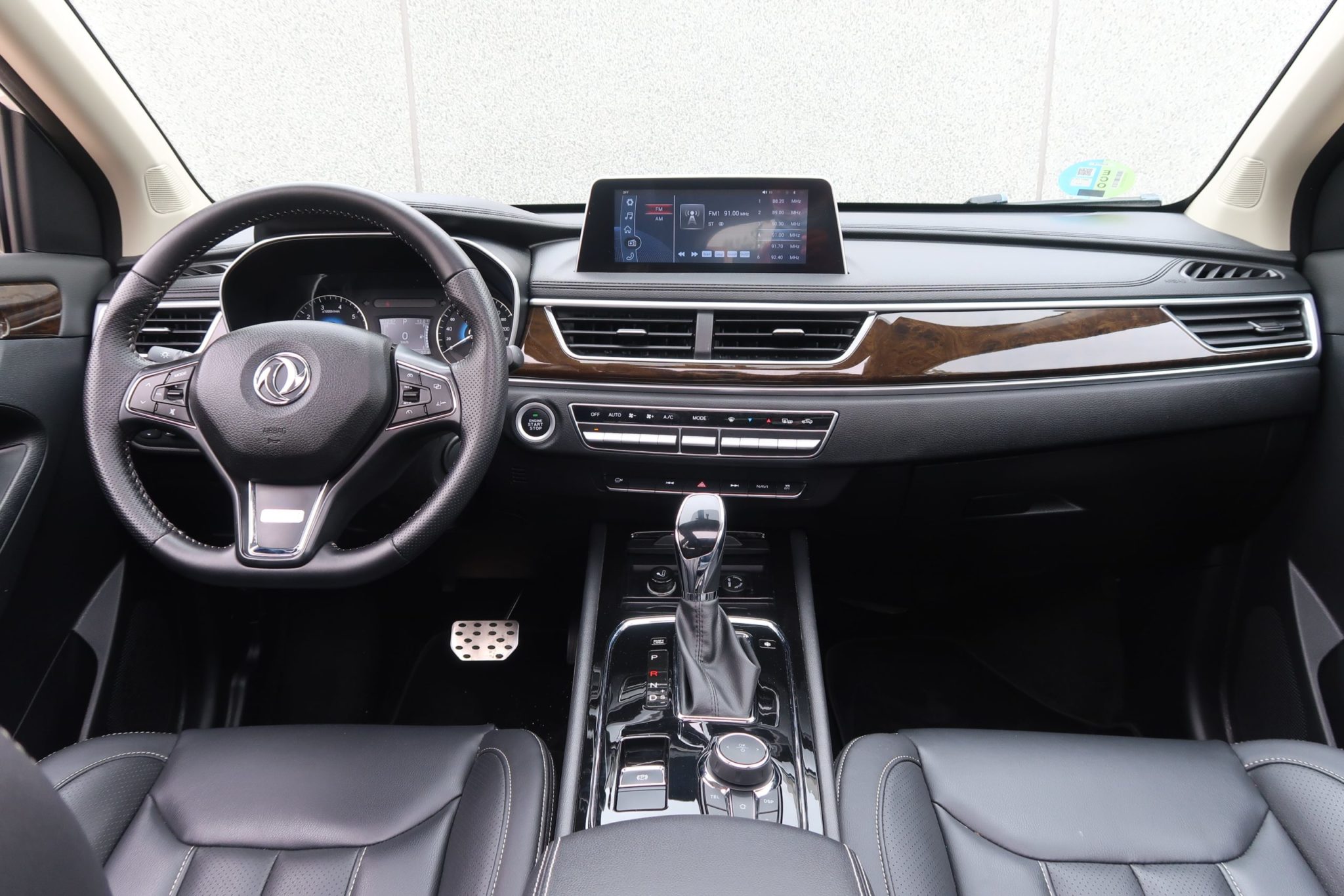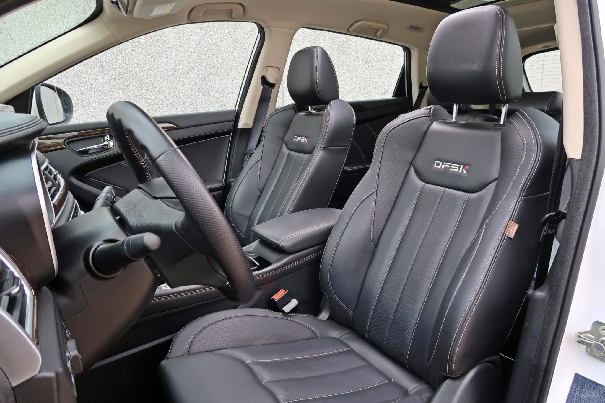 El volante tapizado en un símil de cuero e integra mandos en el volante para manejar el control crucero, movernos por la pantalla monocromática y por la pantalla central. Los asientos están forrados en cuero, integrando las letras DFSK y son cómodos. Los ajustes son eléctricos, aunque echamos en falta algo más de regulación, al igual que el volante únicamente se puede regular en altura. A estos asientos también se le echa en falta la opción de poder ser calefactables. La consola central está bañada en negro piano y podría tener un mejor ajuste, y en ella encontramos la gran palanca del cambio automático, el freno de mano eléctrico y los mandos para manejar la pantalla central.