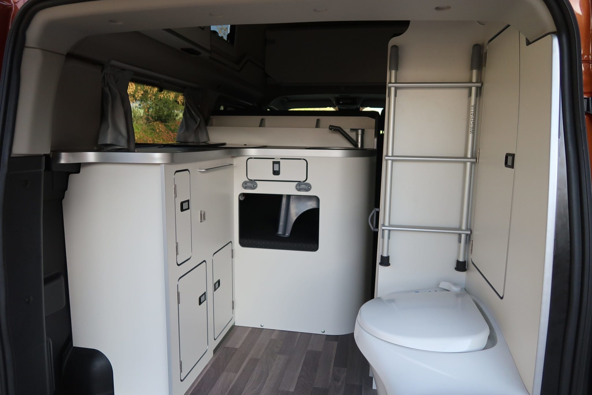 Por dentro es una pasada, cuenta con la última tecnología a bordo (ayudas a la conducción, el sistema de infoentretenimiento SYNC 3 de 8” con navegación, aplicaciones para Apple Car Play y Android Auto, volante multifunción…) para que el conductor tenga la mayor confortabilidad posible. Está homologada para cinco personas, por lo que nos podemos ir en familia sin ningún tipo de problema. Una de las ventajas de esta Nugget Plus, es que al tener el techo tan alto, podemos estar de pie sin tener que agacharnos dentro, y es algo que es un puntazo. Dentro tenemos una pequeña casa rodante, y es que no le falta ni un detalle. Vemos un salón de estar, gracias a que los asientos delanteros se pueden girar para mirar hacia atrás, tenemos dos camas, abundantes muebles con múltiples huecos, dos fuegos, un fregadero, toldo, nevera, un lavabo, una ducha y hasta un váter. El váter está genial, pero hay un detalle que no nos ha gustado del todo, y es que no tiene un compartimento específico y solo hay una cortinilla que separa el interior de esta zona, por lo que los malos olores puede ser que estén presentes.