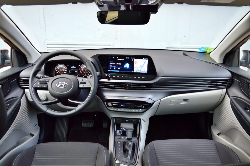 El interior del i20 ha pegado un salto cualitativo en cuanto a calidad apreciada, diseño y ergonomía, presentando un salpicadero muy limpio que integra motivos horizontales. Los materiales utilizados son plásticos duros pero de muy buen ajuste y anclaje. El cuadro de instrumentos, totalmente digital, ofrece una gran cantidad de información y personalización.