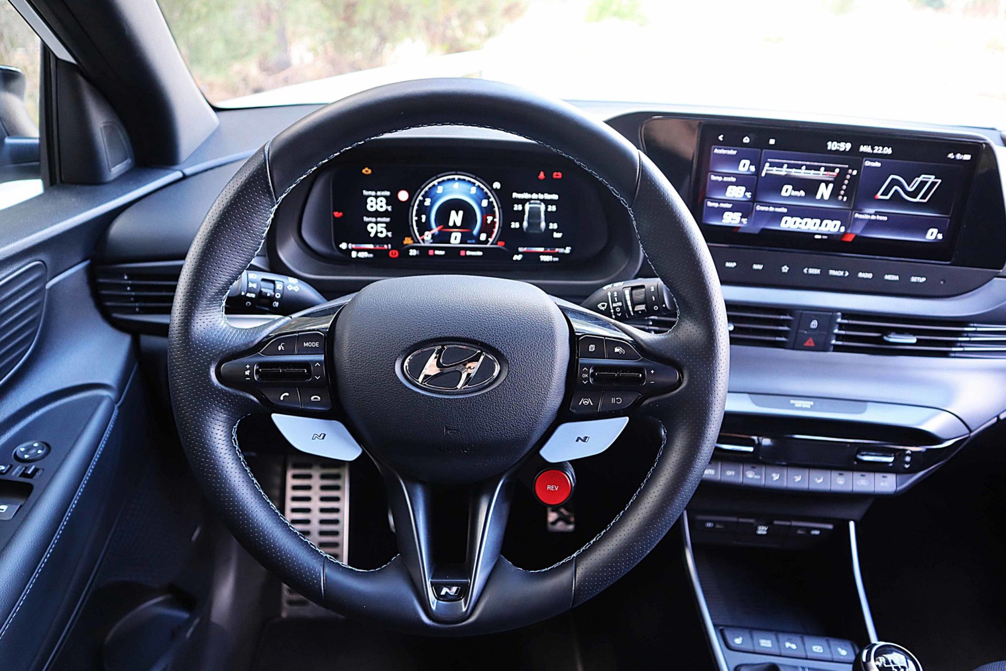 El interior recibe los cambios esperados: manteniendo la estructura del i20 convencional más equipado, se integra un volante deportivo como el del i30N con los botones característicos de los modos de conducción y el Rev Matching; menús N en cuadro de instrumentos y sistema multimedia; asientos deportivos que ofrecen un gran agarre y pomo de marchas también como el del i30N. El resto, todo igual respecto al i20, por lo que te dejamos aquí la prueba de este modelo para que lo conozcas a fondo.