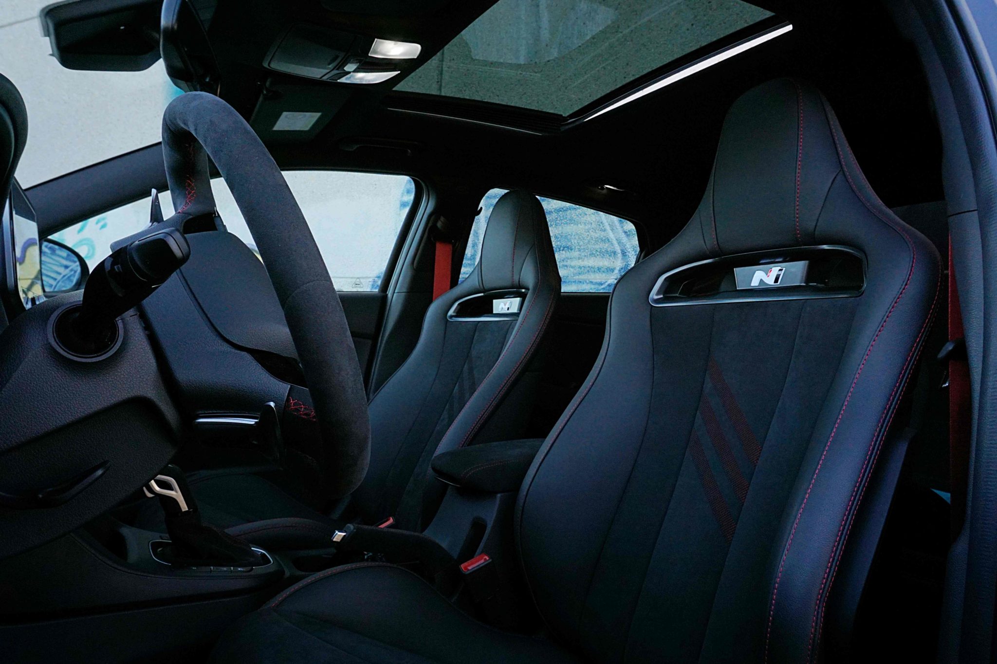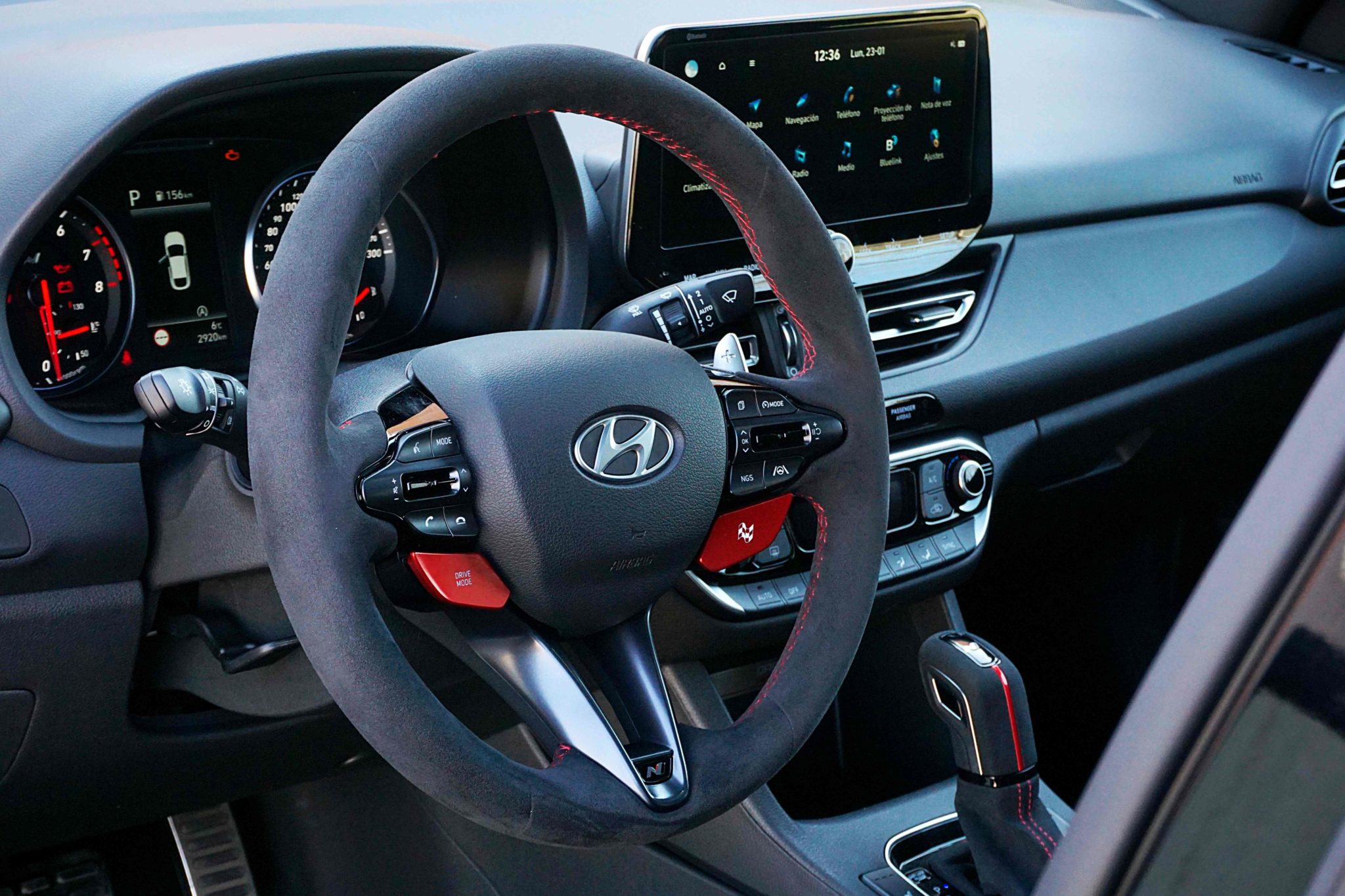 En el interior nos sorprenden detalles muy racing: el volante, forrado en alcantara; los asientos, de tipo semibaquet; pomo de marchas y freno de mano también forrados en piel vuelta, chapa con la unidad de la serie limitada y las coordenadas de la ubicación del centro de operaciones de Hyundai en Nurburgring… No le falta de nada. La pantalla integra el menú N donde podremos configurar el modo Custom y saber en tiempo real datos deportivos más precisos.