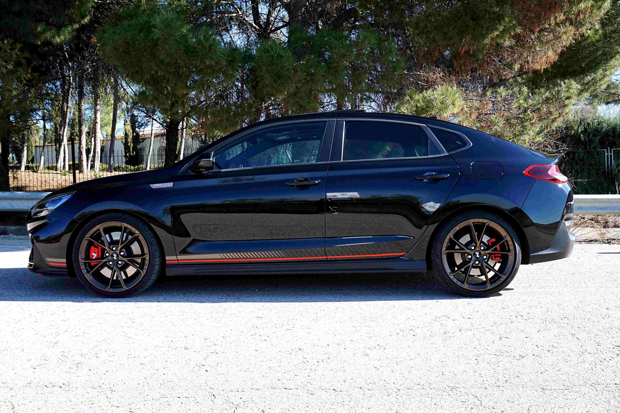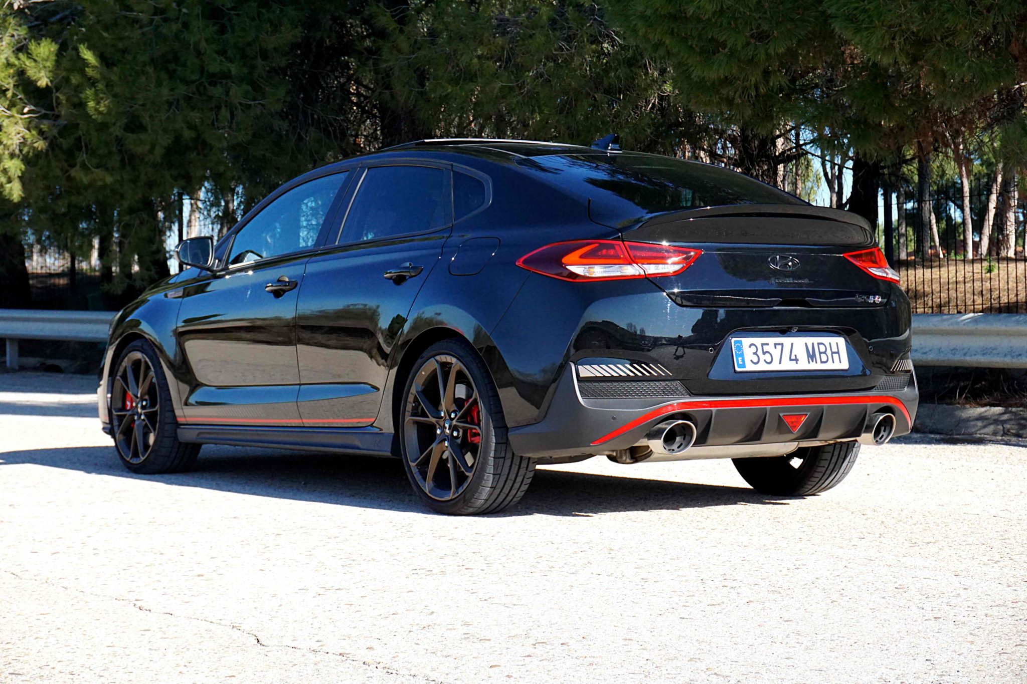 El exterior nos deleita con el color negro Phantom Black o el blanco Serenity White Pearl, sólo hay estos dos colores para la carrocería. Los logos pasan a ser negros y en la zona inferior del frontal hay una línea roja. En el lateral han añadido adhesivos junto a las taloneras, y en la trasera el logo de Hyundai y el nombre Fastback también están pintados de negro. Las llantas son uno de los elementos que más llaman la atención, ya que son forjadas y pasan a ser color bronce.