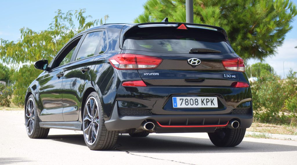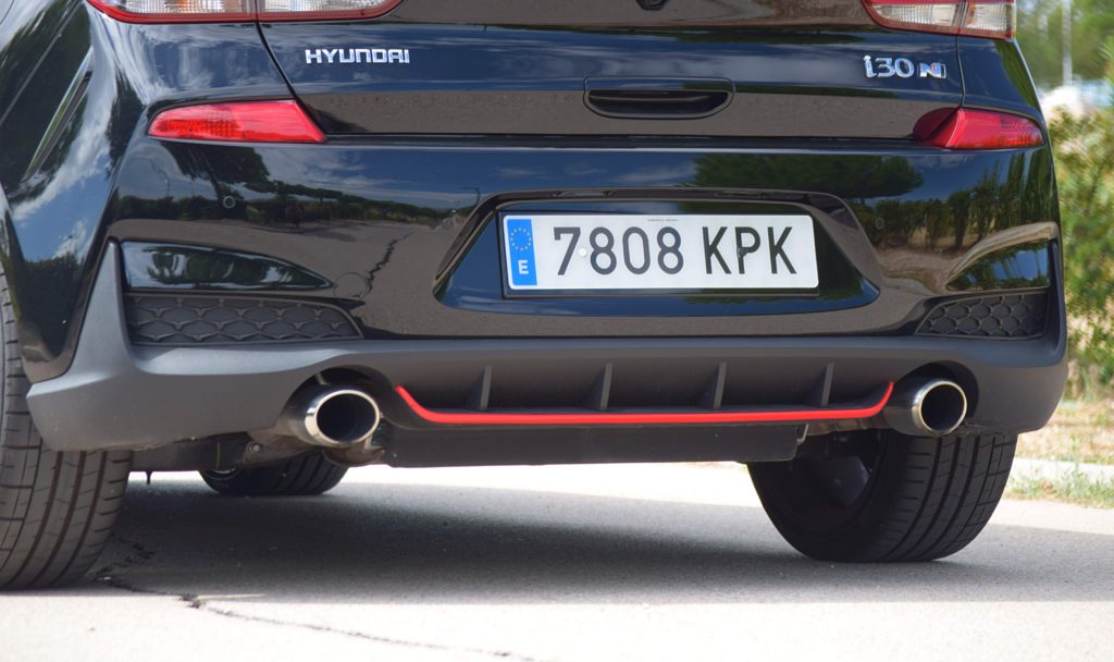 En esta versión Performance encontramos varios cambios mecánicos con respecto a un N convencional, y algunos muy significativos, como la incorporación del diferencial autoblocante E-LSD mecánico pero de gestión electrónica, un sonido de escape aún más ruidoso y unas ruedas y frenos más grandes y potentes. Estéticamente, podemos apreciar en la parte delantera un paragolpes más aerodinámico y con mejoras en el flujo de aire para refrigerar mejor. En el lateral, este i30 nos enamora con esas preciosas llantas de 19pulgadas y pinzas de frenos en rojo, que combnian fantasticamente con el color Phantom Black, y unas taloneras para darle un toque más bajo. En la trasera reina el alerón que sin duda es indispensable tanto por la aerodinámica como por la deportividad que aporta, mientras que en la parte inferior destaca un difusor con linea roja y dos salidas de escape atronadoras en el modo N.