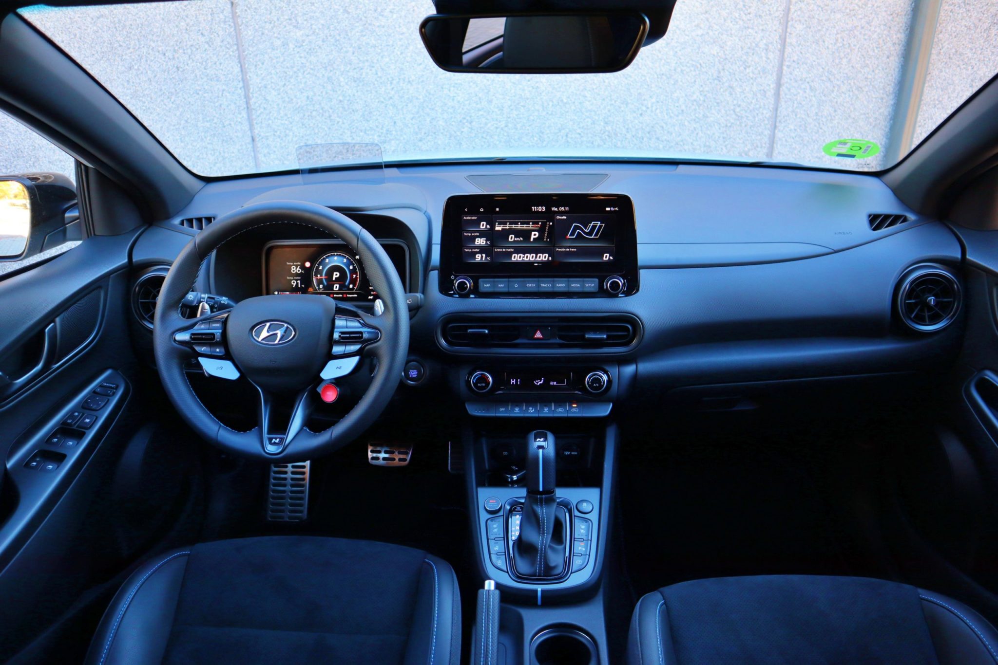 El interior del Kona N transmite deportividad gracias a sus elementos, que mantiene en cuanto a distribución respecto un Kona convencional. Lo primero que destaca es el volante, con un tacto inmejorable y con distintos botones que llaman la atención, que son para cambiar entre los modos de conducción, el modo N y el modo N Grin Shift. El cuadro de instrumentos, totalmente digital, muestra una gran cantidad de información, teniendo además del ordenador de abordo, distintas visualizaciones que van de la mano de los modos de conducción y del modo N. El sistema multimedia, de grandes dimensiones, mantiene todas las funciones que podríamos encontrar en el Hyundai Kona más equipado, incluyendo además el modo N, donde tendremos bajo control todos los parámetros deportivos en nuestro Kona N. Dentro de este modo, destaca el menú de opciones donde podremos configurar todos los elementos como la suspensión, la dirección, la salida del escape…