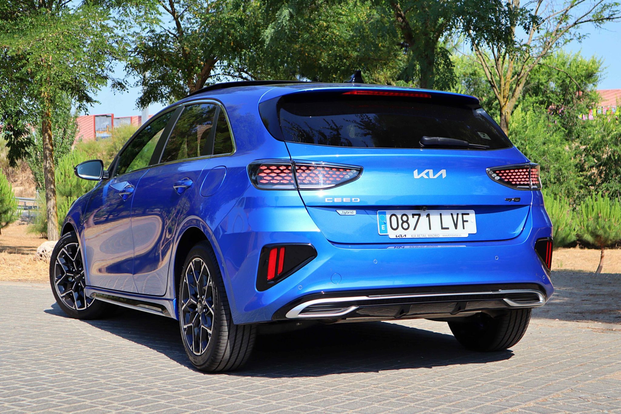 La estética de este Ceed GT Line se desmarca de las versiones convencionales. Sus paragolpes tienen toques más deportivos, como el delantero, que tiene una mirada más agresiva y entradas de aire en los laterales. En el lateral destacan las llantas de 17”, taloneras en color negro y un techo panorámico practicable. En la trasera encontramos un cambio muy significativo: los faros. Estos son específicos para esta versión, con muchos pilotos led. Debajo se ubican los emblemas de la versión y propulsión, y en la zona inferior podemos ver un difusor negro que integra cromados grises que simulan ser salidas de escape. El color de la carrocería es el Blue Flame.