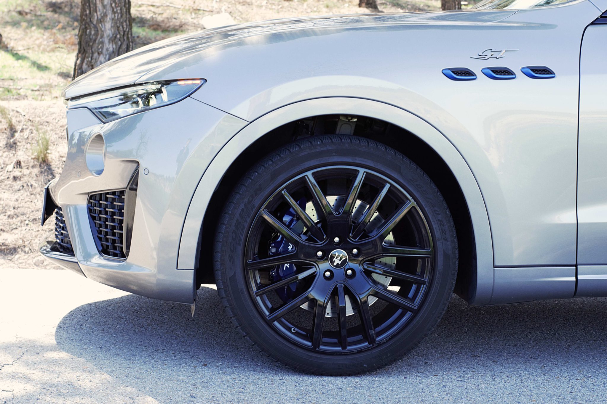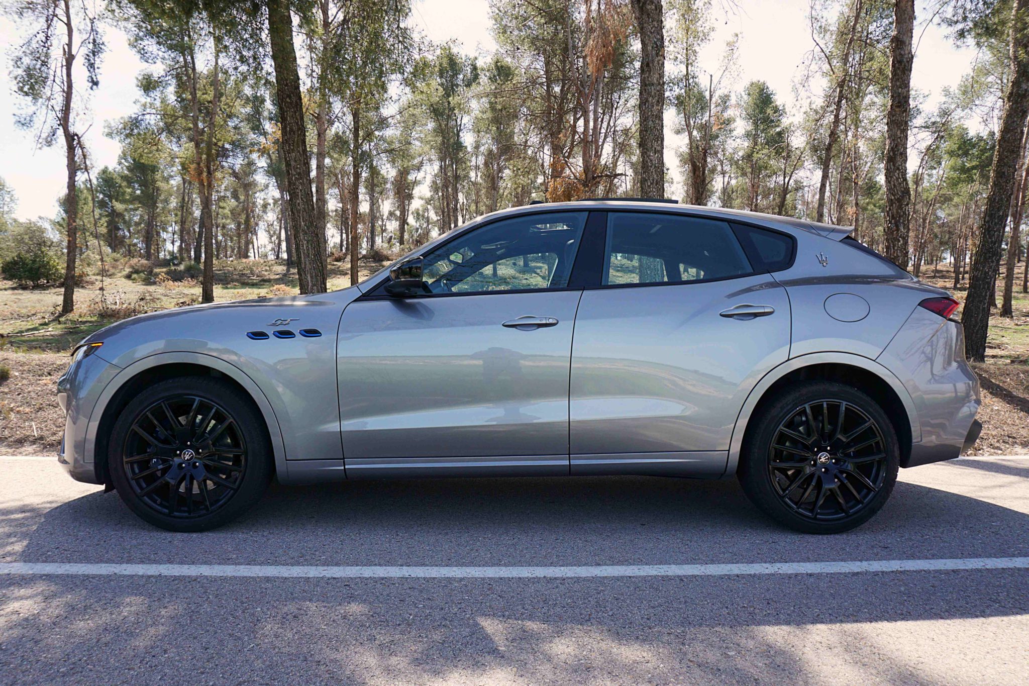 En cuanto a su estética, este Levante no podía ser más italiano. Esta unidad tan especial traída de esas tierras nos alegra la vista con un diseño imponente, musculoso, con un frontal muy marcado gracias al tridente y a los faros afilados. La parrilla es muy grande, con entradas de aire incluso en la zona inferior. En el lateral vemos el logo GT acompañado de detalles en azul cobalto, toque personal de la versión Hybrid. Las llantas de 21” de esta unidad son las Anteo Black, con neumáticos en medidas 265/40 en el eje delantero y 295/35 en el trasero. Arriba encontramos techo panorámico practicable y en la trasera reina el spoiler y el difusor negro que integra cuatro salidas de escape de verdad.