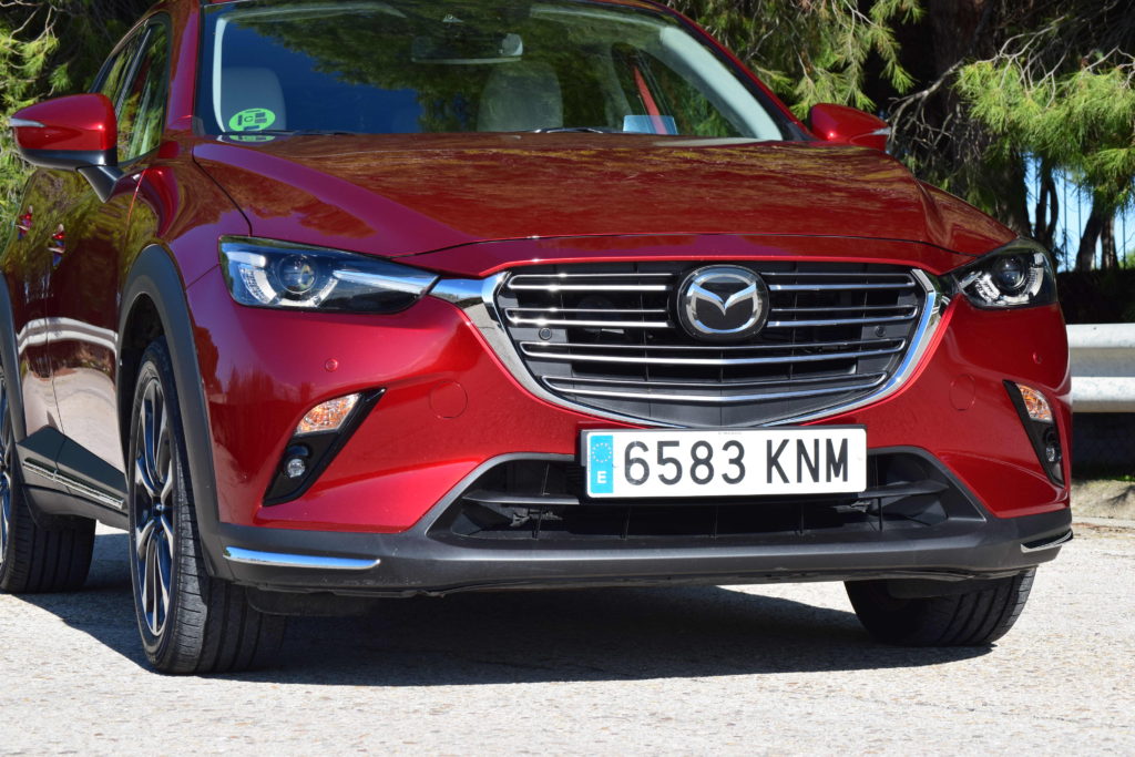 En la parte delantera, destaca un nuevo parachoques con la parrilla en forma de ala que se unen completamente con los nuevos faros afilados en Led, en la parte baja encontramos revestimientos en plástico negro para darle ese toque Suv, pero sin perder la elegancia gracias a los cromados laterales. El capó tiene dos nervios exteriores muy marcados que llegan hasta la parrilla. En el lateral lo que más llama a nuestros ojos es una línea de cintura bastante alta que le hace muy atractivo. Las nuevas llantas de 18” bicolor que son de serie en los acabados más altos, le sientan genial con la carrocería y con los contrastes en negro y cromado del coche. La antena es de tipo aleta de tiburón. Y la parte trasera destaca por ser muy ancha y bajita dándole un toque muy deportivo. En ella encontramos detalles como dos salidas de escape funcionales y unos nuevos faros en Led con forma muy picuda compartiendo un ADN parecido al de su hermano el Mazda 2.