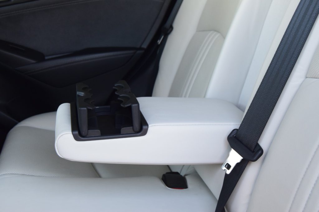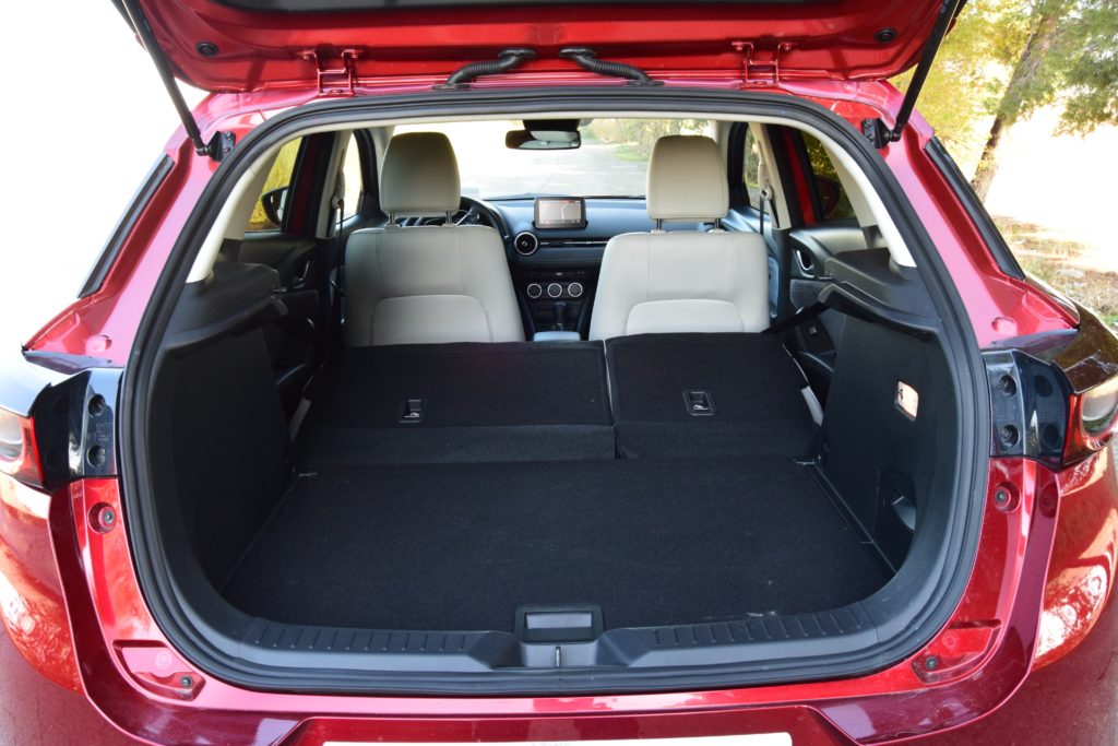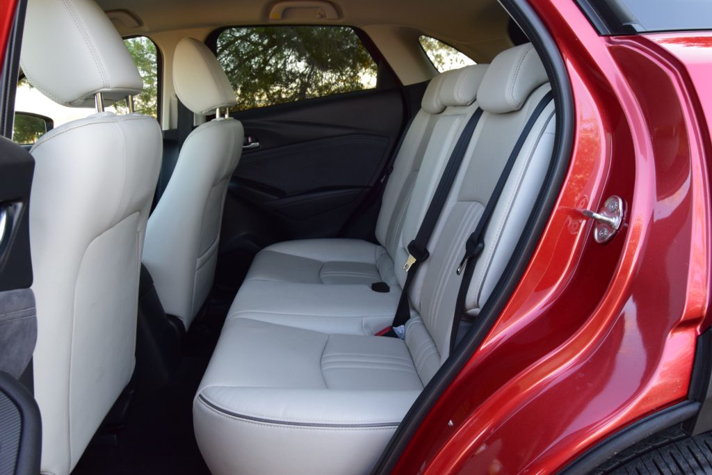 El acceso a la plazas traseras del CX-3 es bueno, con un correcto ángulo de apertura de la puerta, aunque hay que tener algo de cuidado con el pilar superior del coche si somos muy altos, para no darnos en la cabeza. Aquí detrás se respira la misma calidad de los materiales que en las plazas delanteras, gracias a una banqueta forrada en cuero blanco. Estos asientos laterales son realmente cómodos para un viaje largo, y nos equipa un apoyabrazos central que viene de perlas. El espacio es correcto tanto para piernas como para cabeza, y la plaza central cuenta con un túnel de transmisión pronunciado, debido a la tracción a las cuatro ruedas, y con un respaldo algo duro, por lo que nosotros la recomendamos únicamente para un niño o adulto en un trayecto corto. En las puertas encontramos unos pequeños huecos para depositar objetos y una redecilla en la parte trasera del asiento del acompañante para dejar algún que otro libro. Respecto a la visibilidad, como en las plazas delanteras, peca de ese diseño exterior tan espectacular, aunque no es, ni mucho menos, agobiante.