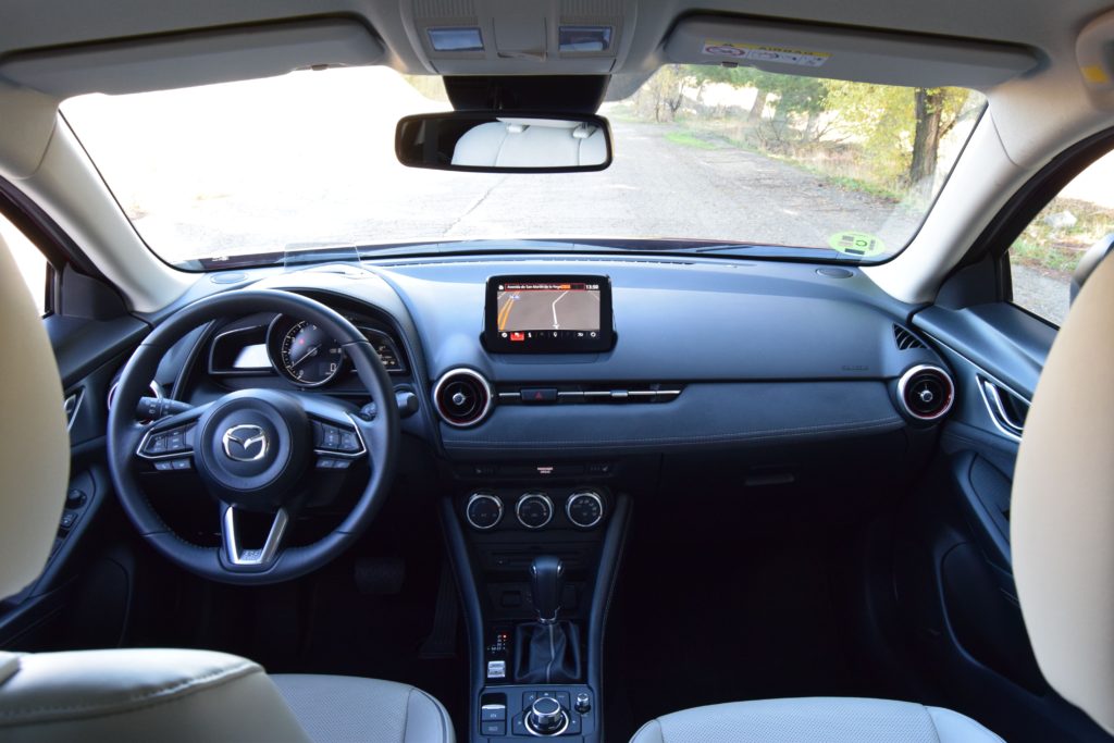 Pasamos al interior, y lo primero que llama la atención es la buena calidad de fabricación, utilización de materiales de gran calidad y el ajuste de todas las piezas está muy logrado, lo que es poco usual de ver en un B-SUV de otras marcas. Otra de las cosas que más llama la atención al montarnos, es que sus cristales tienen un tamaño algo más reducidos que en otros modelos de su categoría, pero que al conducirlo no afecta en exceso a la visibilidad delantera. Los asientos, en este acabado más alto, podríamos decir que parecen de un coche de alta gama, y esto se debe a que el cuero blanco empleado por Mazda es de una calidad sensacional, aportando al conductor a la vez una elevada sensación de comodidad. El diseño del salpicadero es muy original y es prácticamente idéntico al del Mazda 2. En lo alto del centro del salpicadero, encontramos un sistema de infoentretenimiento de 7” de tipo flotante, situado en una posición perfecta para no desviar casi nada la vista de la carretera. Es táctil cuando nos encontramos con el coche parados, pero deja de serlo cuando iniciamos la marcha, pasando a manejarse con una serie de botones situados en la consola central, por lo que es un acierto. Otro sistema que destaca en este CX-3, es que introduce un Head-up Display que también ayuda a que únicamente estemos pendiente de conducir y no bajar la vista hacía la instrumentación para consultar algo, ya que este sistema nos proyecta ayudas a la conducción, velocidad en digital, reconocimiento de señales… por lo que el puesto de conducción de este Mazda es ejemplar, tenemos todo a nuestra disposición. Respecto a huecos en las plazas delanteras, encontramos en las puertas, y ahora gracias al restyling recibido, equipa de serie en todos los acabados un freno de mano eléctrico con Autohold, ganando un apoyabrazos central y más huecos en la consola central, por lo que no está nada mal.
