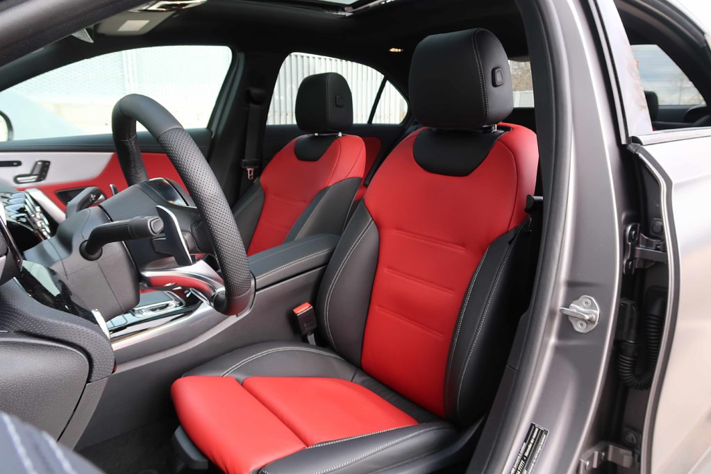 En el interior encontramos un habitáculo amplio, con buenas calidades y detalles gracias a diversos paquetes configurables, como el Premium. El sistema MBUX reina en estas plazas delanteras, ya que da la impresión de una única pantalla que incluye tanto el cuadro de instrumentos como el sistema multimedia. En ellos, son novedad en esta versión AMG las pantallas y menús AMG para poder ver los parámetros y datos deportivos como temperaturas, potencia, presión del turbo… El sistema incluye conectividad, navegación, todo tipo de reglajes del vehículo además de sistema de sonido Burmester e iluminación ambiental.