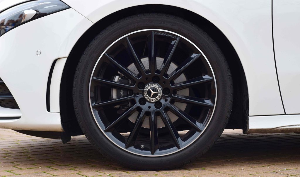 Estéticamente, podemos ver la línea tan baja que caracteriza al Clase A, con un paragolpes muy aerodinámico y unos faros afilados. En el lateral destacan las preciosas llantas AMG de 19 pulgadas que combinan perfectamente con el color blanco de la carrocería y con el techo panorámico practicable. En la trasera encontramos unos faros más horizontales y afilados y un difusor aerodinámico negro que envuelve dos salidas de escape falsas.