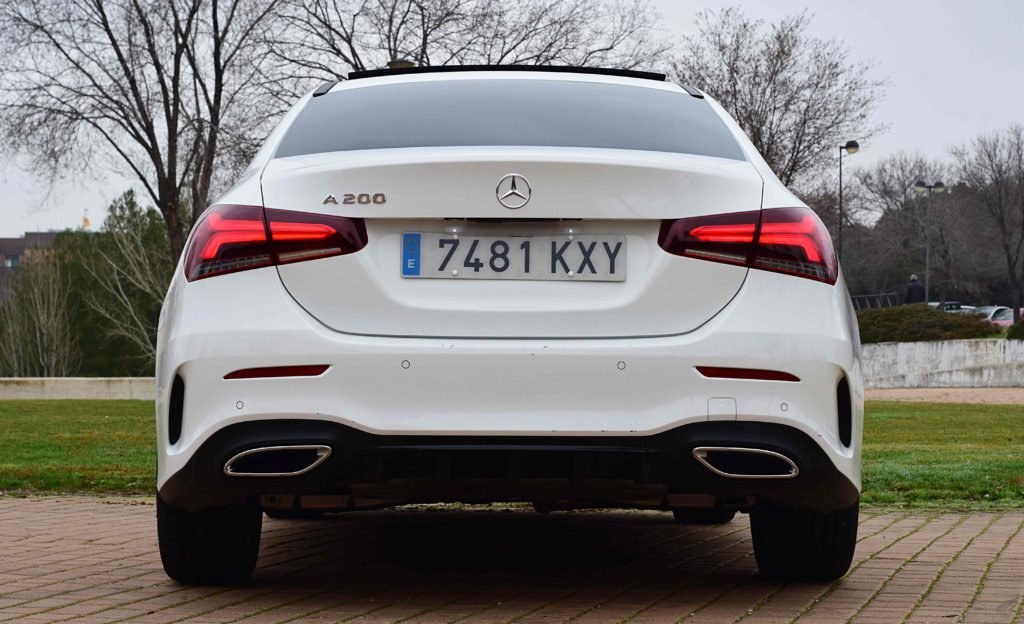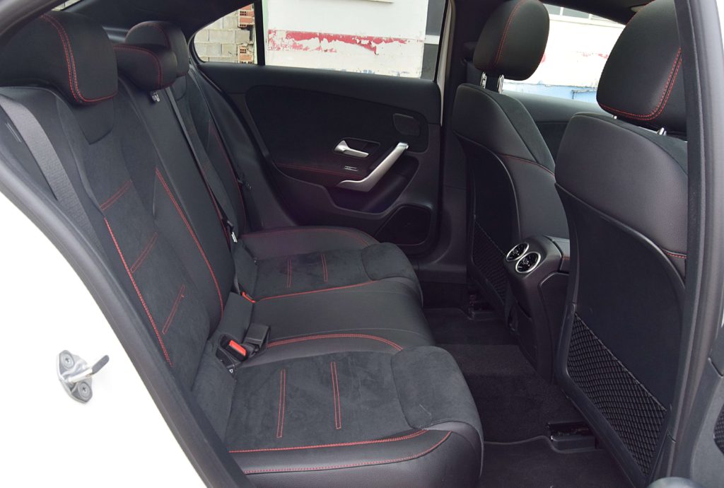 Las plazas traseras son muy espaciosas y también continuan la calidad y el diseño de las delanteras. El túnel de transmisión es pronunciado debido a que las versiones 220 y 35 AMG tienen tracción 4MATIC. El maletero es de apertura automática y dentro encontramos 420L de capacidad, 50 más que la versión hatchback. Debajo del piso contamos con kit antipinchazos y el subwoofer de sistema de sonido.
