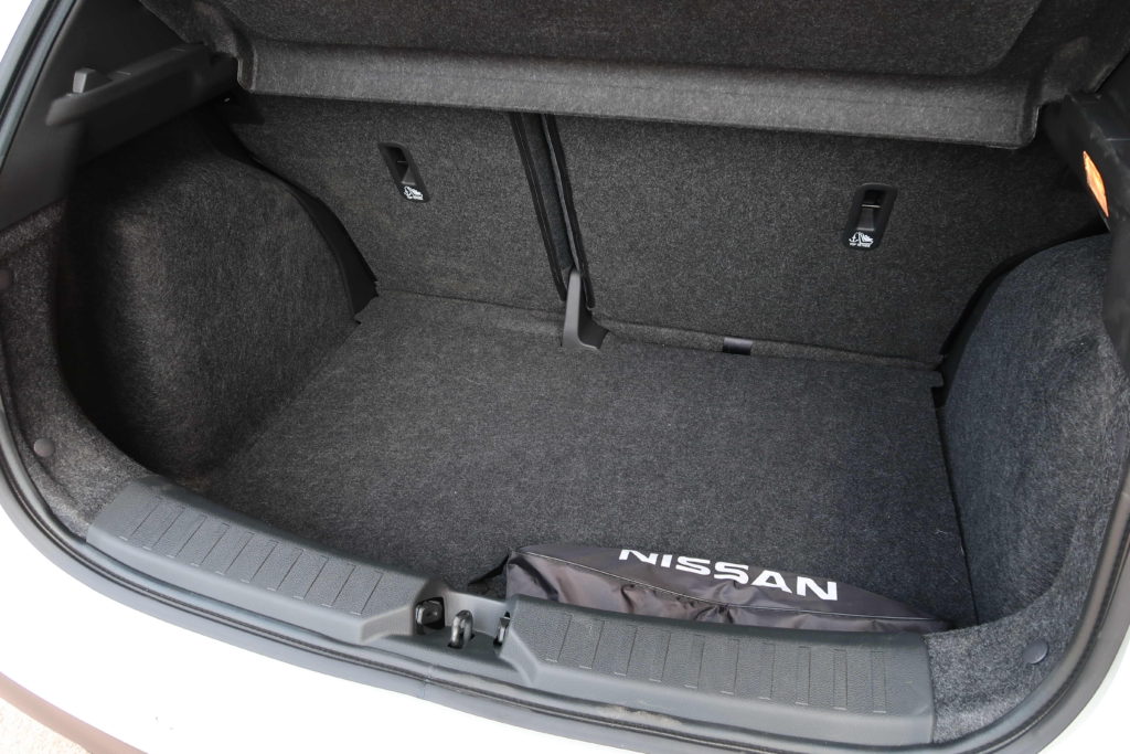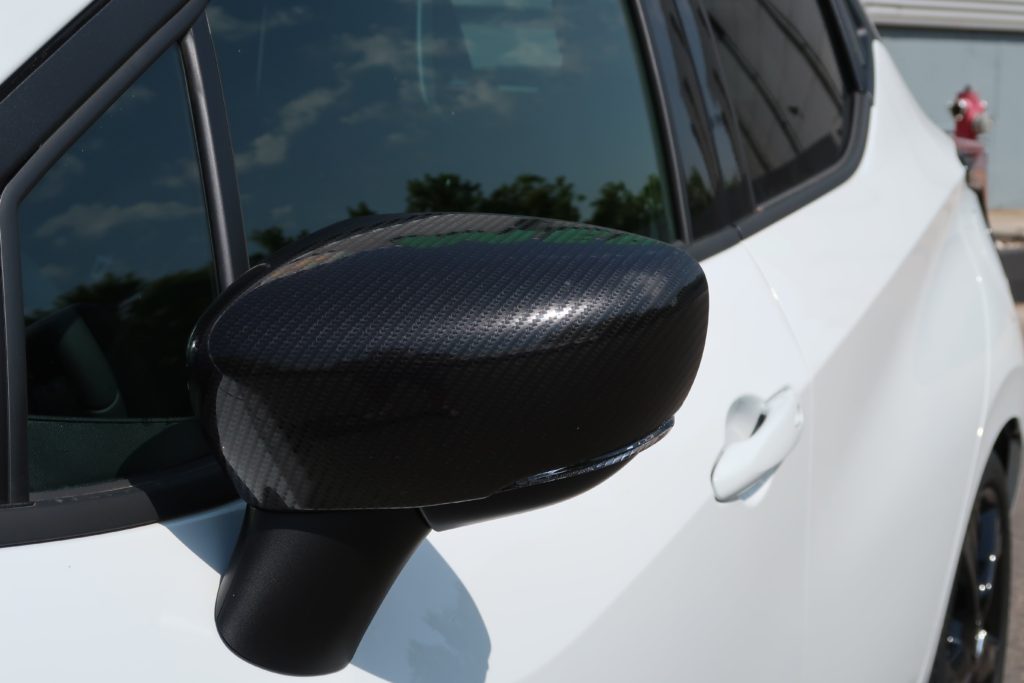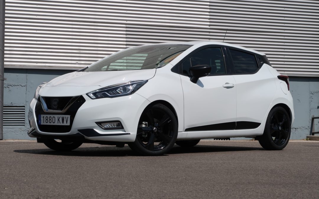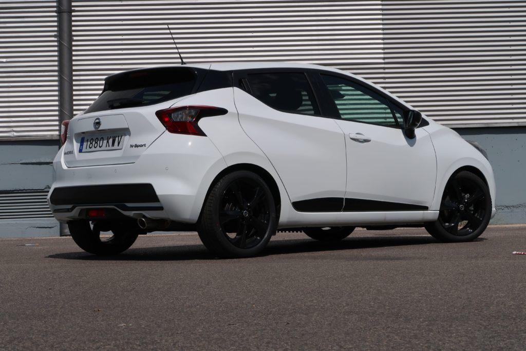 Y ahora centrémonos en el acabado N-Sport, el cual presenta cambios exteriores prácticamente imperceptibles al ojo humano, ya que podríamos llegar a confundirlo con un acabado Tekna. Únicamente nos daríamos cuenta de ello porque en el portón maletero nos incluye en el acabado que estamos, nos incluye una salida de escape funcional y porque los retrovisores están forrados en símil de fibra de carbono. Más allá de lo poco que cambia el exterior, este Nissan Micra incluye una suspensión deportiva que rebaja la altura del coche 10mm, unas llantas de 17” en color negro idénticas a la del tekna, el chasis y dirección también se ha revisado para mejorar el paso por curva, y solamente está disponible en 4 colores de carrocería, el blanco de nuestra unidad, rojo, negro y gris.
