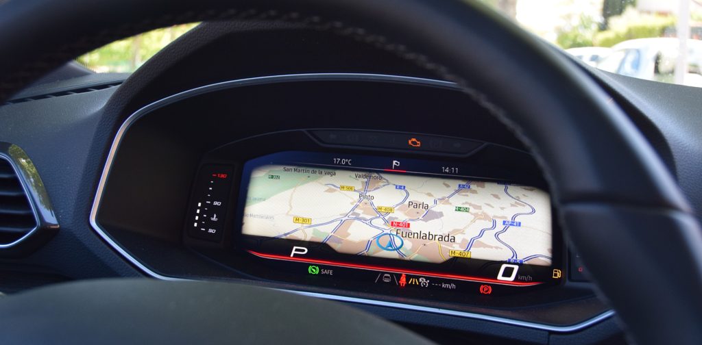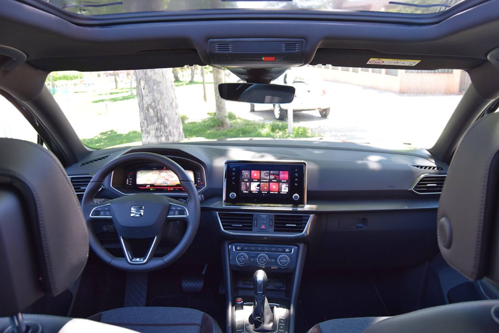 En el interior podemos apreciar un habitáculo muy propio de la marca, con pocas novedades en diseño pero con muy buenos materiales. El Digital Cockpit y la pantalla de infoentretenimiento de 8″ cumplen con todos los apartados de tecnología y conectividad. Dependiendo si queremos ser más o menos gastones, podremos ir añadiendo equipamiento al Tarraco. Una opción que nos ha encantado son las cámaras de 360º, muy útiles a la hora de aparcar o de ir por pistas de tierra. Los asientos de serie no están nada mal, a los cuales les podemos añadir calefacción con el paquete invierno y reglajes eléctricos, aunque esta última opción solo al piloto. En opción podremos escoger unos asientos de cuero, más premium. En cuanto a huecos, son amplios para guardar objetos. Destaca el techo panorámico practicable, muy recomendable de montar, y el audio Beats, que suena de maravilla.