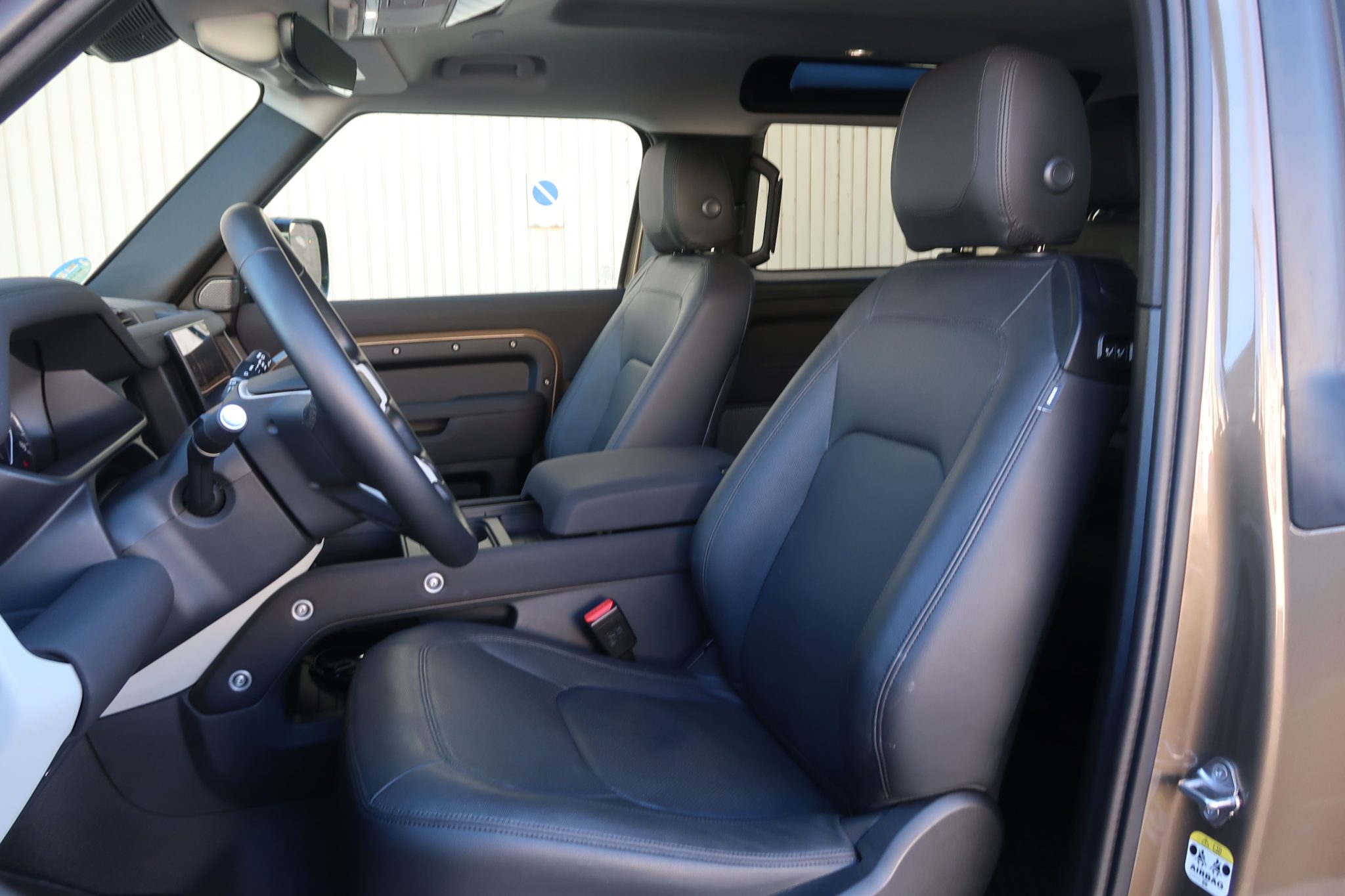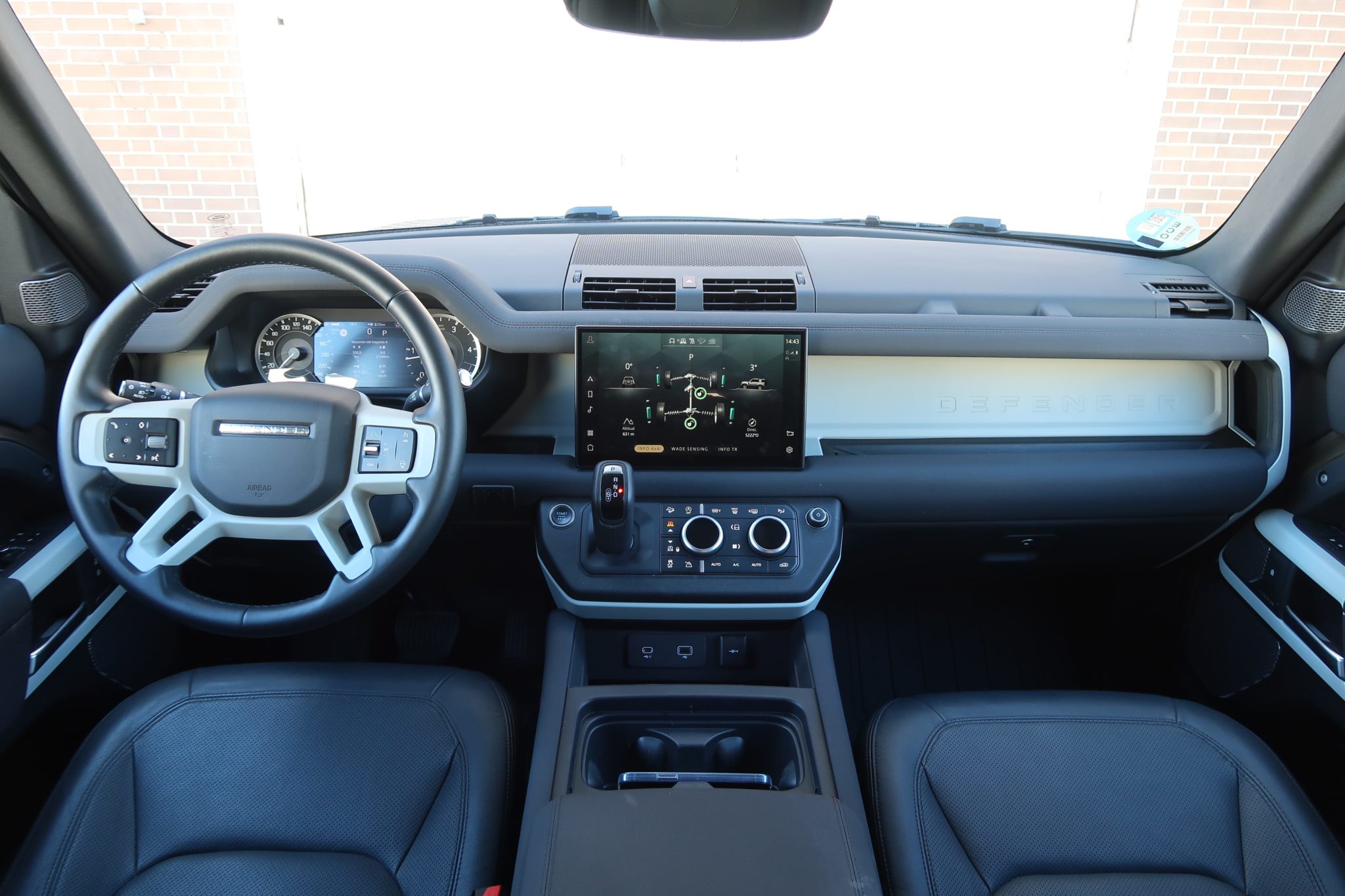 En marcha este Defender va de maravilla, se nota que es un coche de lujo, y es que el nivel de confort e insonoridad es brutal. Su 3.0 diésel de 6 cilindros y 200cv, mueve muy bien al conjunto e incluso nos deleita con un sonido precioso del motor. Nos entrega 430Nm de par a las 1.400rpm, homologando un consumo de unos 8,6 litros, que en nuestra prueba de más de 600km combinando todo tipo de vías, consumió 9,5 litros. Gracias a los 83,5 litros de deposito de diésel podremos hacer más de 800km del tirón. En carretera de curvas se nota un coche algo torpe debido a los balanceos de carrocería y por su poca aerodinámica y en ciudad gracias a un gran radio de giro, se maniobra genial con él. La visibilidad es buena en casi todos los ángulos y parece que vas manejando todo como si estuvieras en un camión, es una pasada. La parte trasera, sí que es verdad que se ve algo mal desde el espejo interior debido a la rueda de repuesto y los reposacabezas traseros.