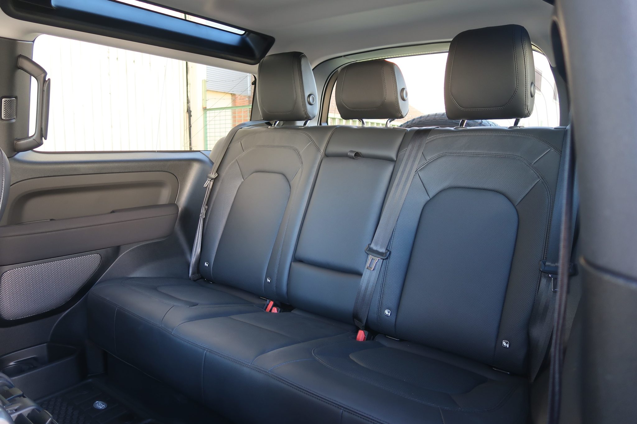 Su interior muestra detalles tanto lujosos como prácticos, gracias a todo el suelo forrado en goma para poder limpiarlo si vamos fuera de asfalto y lo ensuciamos. En las plazas delanteras vemos dos asientos de cuero que son bastante cómodos y notamos que hay mucho espacio entre el conductor y el acompañante con una consola central muy grande, donde podríamos colocar otro asiento de manera opcional. Como detalles de lujo encontramos una buena calidad de materiales en las zonas más altas y un sistema de infoentretenimiento de 11,4” con muchísimas información 4×4, cámaras de 360 grados que se ven de cine, mapas y por supuesto conectividad plena. Debajo de esta pantalla encontramos la palanca del cambio automático y los mandos para manejar todas las herramientas para salir fuera de asfalto y para manejar el climatizador bizona, que podría ser trizona de manera opcional. El puesto de conducción es ergonómico gracias a una posición bastante alta de conducción y una instrumentación en este caso semianalógica, con una pantalla central donde podremos ver abundante información. El volante es muy grande y está forrado en cuero, además en el vemos los típicos mandos para manejar el control crucero, movernos por la instrumentación y el sistema multimedia.