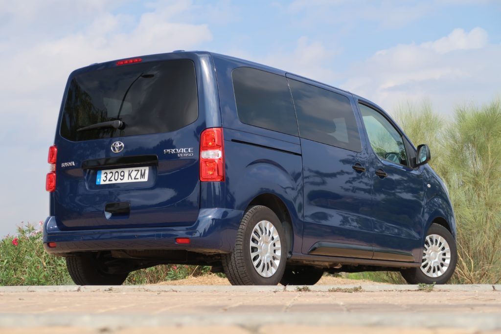 El maletero es de apertura manual en todas las versiones. En las versiones industriales tendríamos dos puertas laterales, mientras que en las versiones familiares cuenta con un único portón que se abre hacia arriba y es de grandes dimensiones. Para abrirlo tendremos que tener cuidado si aparcamos cerca un muro para no golpearlo, para ello Toyota en las versiones más equipadas instala una apertura de la luneta trasera, por si queremos sacar del maletero un objeto relativamente pequeño no tengamos que abrir el gran portón trasero, aunque en este caso nuestro Proace Verso no lo equipa. Dentro encontramos una boca de carga bajita para introducir bultos pesados y por debajo del parachoques una rueda de repuesto. Con las 8 plazas instaladas encontramos un maletero ya grande (603 litros) y donde cabría el equipaje de 8 personas en una escapada de fin de semana. En este Proace Verso la segunda y la tercera fila de asientos podríamos dejarla en casa, ya que se pueden extraer. Por ello dejando solo las 5 plazas agrandamos el maletero hasta nada más y nada menos que 2381 litros. Si aún necesitamos más espacio se puede extraer esa segunda fila y dejando únicamente dos plazas para ganar un maletero de más de 5.000 litros. Si necesitamos mover objetos muy largos, la plaza del copiloto se puede abatir para ganar ese plus de espacio. Como vemos este Proace Verso nos ofrece mucha versatilidad y espacio, y es un modelo imbatible en este apartado.