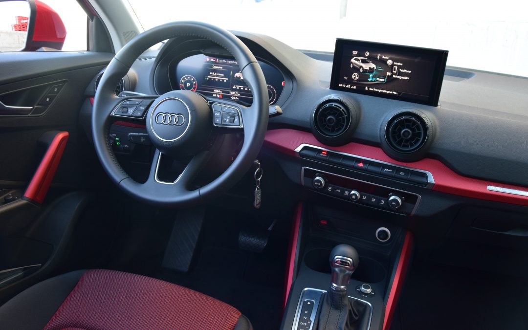 El interior de este Q2 se caracteriza por tener un diseño muy minimalista, personalizable y de gran calidad. Los materiales empleados son excelentes y aportan una sensación de superioridad con respecto interiores de otras marcas. Todo el interior es una combinación de negro-rojo para combinar con el color rojo tango metalizado que tiñe la carrocería de este Q2.