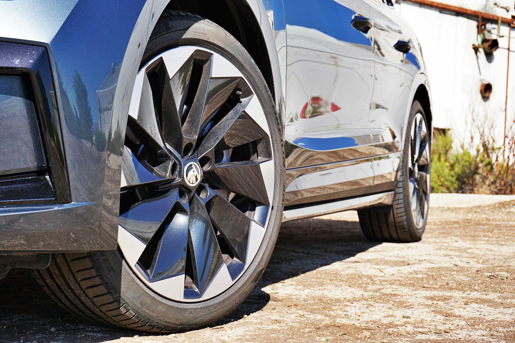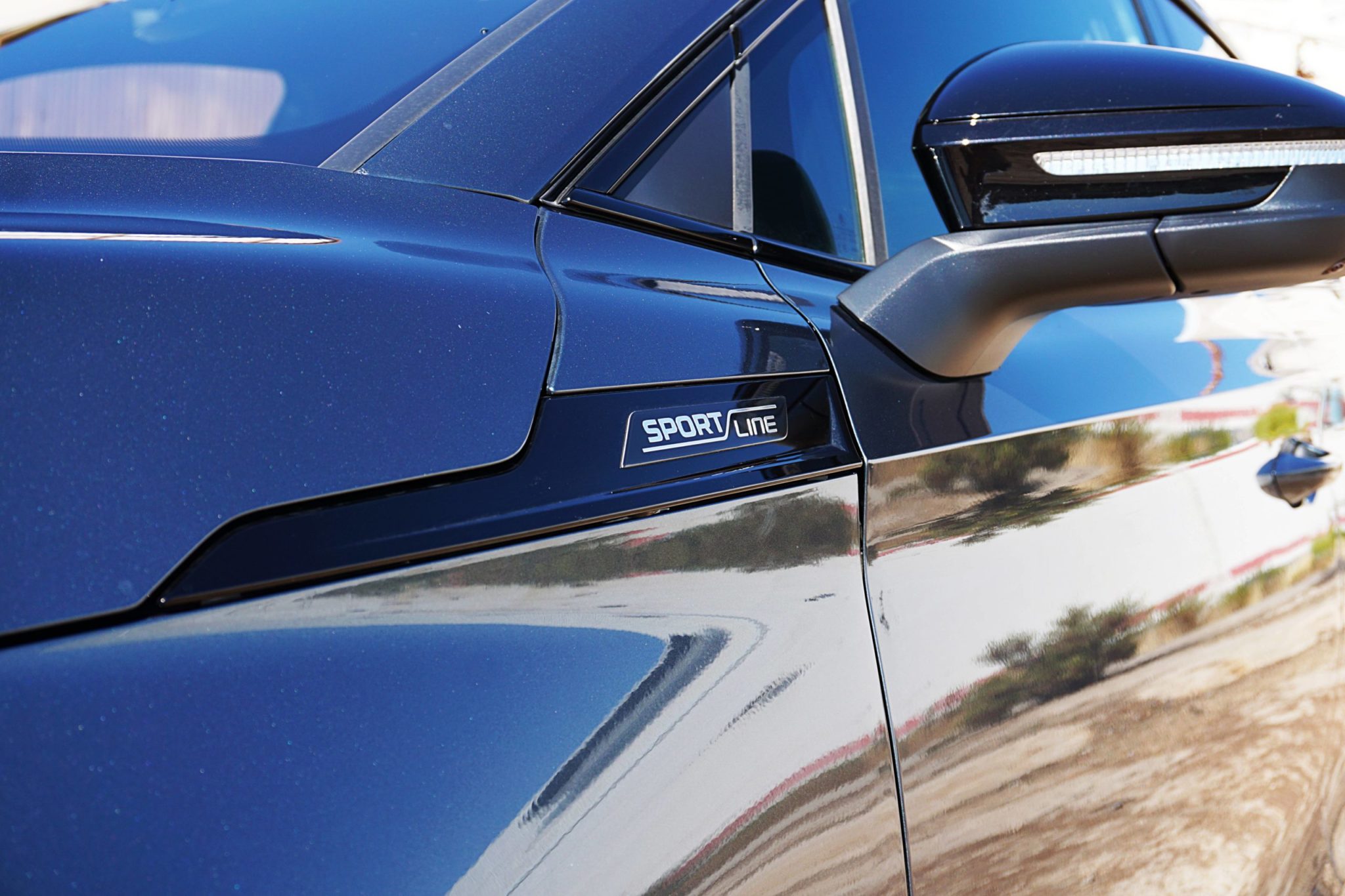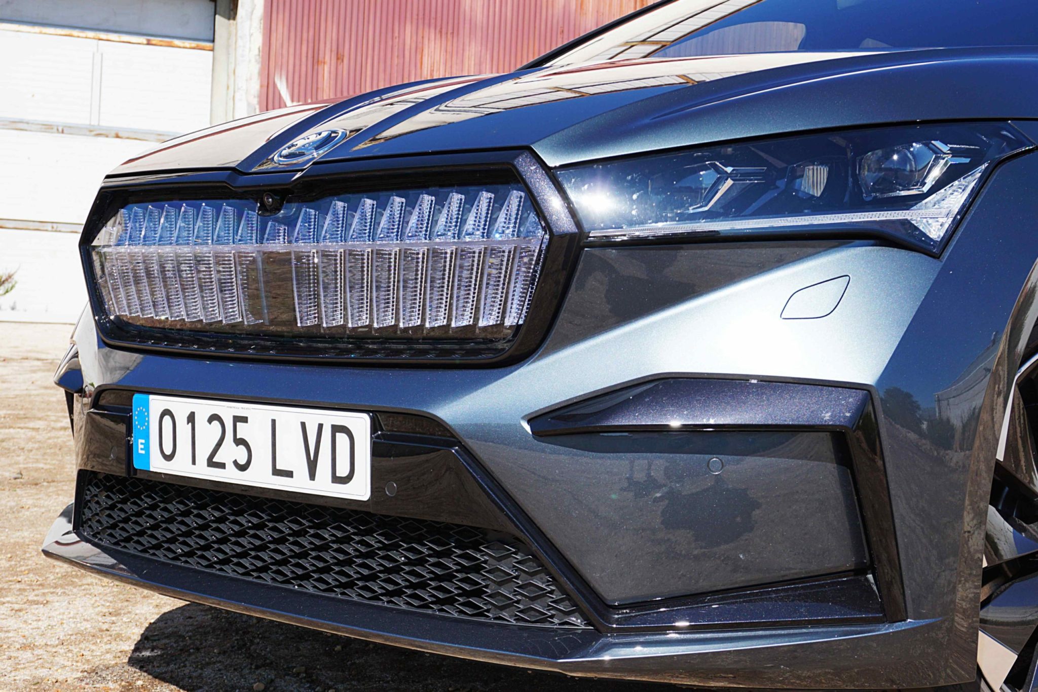 En su diseño y apariencia, este Enyaq es un SUV atractivo gracias a sus líneas y al acabado Sportline de esta unidad, que aporta gran deportividad gracias a extras como el Crystal Face, la parrilla iluminada por 131 LED, junto con las enormes llantas Betria de 21 pulgadas. Los emblemas aparecen en color negro para darle un toque más distintivo, y como otros elementos a mencionar dispone de faros matriciales que iluminan excelentemente, además de iluminación ambiental en su interior.