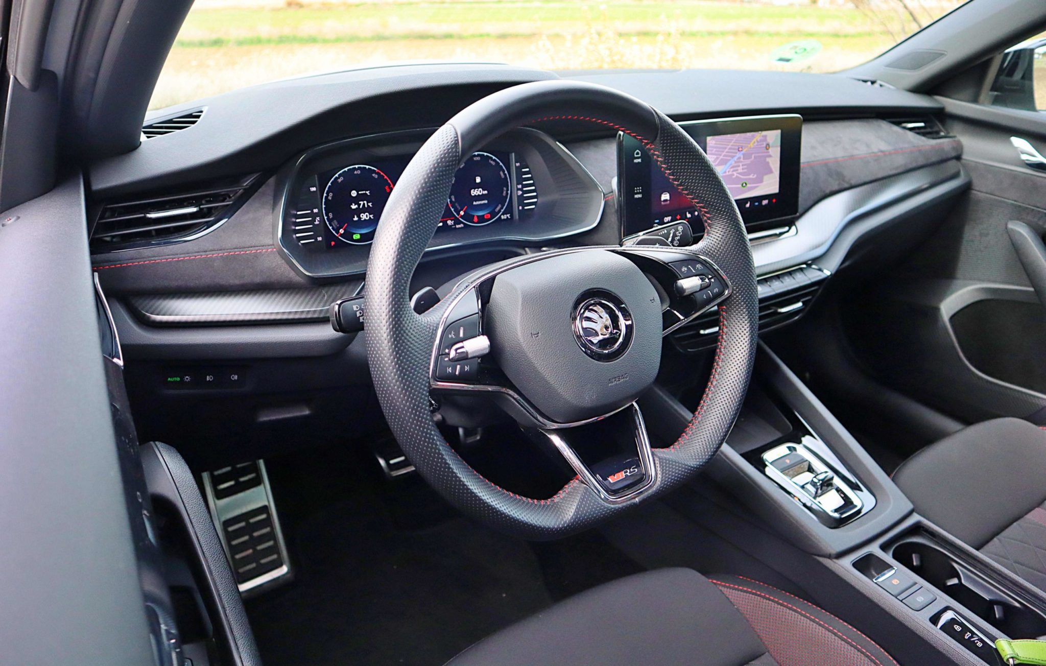 En el interior (te contamos más a fondo en la prueba general del Octavia Combi), encontramos al Octavia con más equipamiento y tecnología a bordo. Digital Cockpit, pantalla del sistema multimedia de 10,1″ con navegación, conectividad, reglajes y justes del vehículo, cámara trasera con sensores y park pilot… más completa, imposible. El volante, de tres radios, integra el logo RS, y es uno de los elementos deportivos que integra esta versión, al igual que los asientos, que son de estética semibaquet y tienen reglajes eléctricos y calefacción en 3 intensidades. Además de los toques racing que encontramos por el salpicadero, esta unidad integra techo panorámico practicable, un extra que para nosotros es imprescindible. El sistema de sonido Canton viene de serie en este acabado, con 8 altavoces y subwoofer.