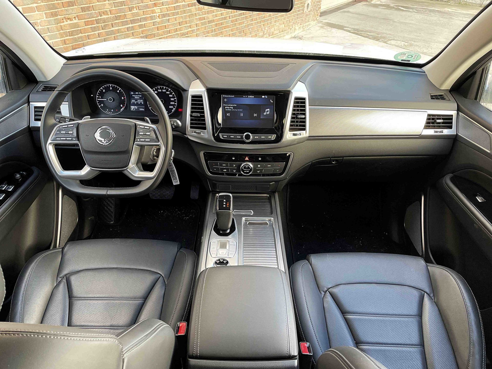 En el interior de este Rexton Premium, el acabado intermedio de la gama, nos acoge con un equipamiento básico: el cuadrod e instrumentos es clásico (el digital solamente está incluido en el cabado Limited) y un sistema multimedia de 8″ con conectividad que destaca por su sencillez pero no por su fluidez o calidad. Los asientos son de cuero, el material es bueno y los reglajes son manuales. Tanto el diseño general como los materiales de este interior son normales, cumplen su cometido.
