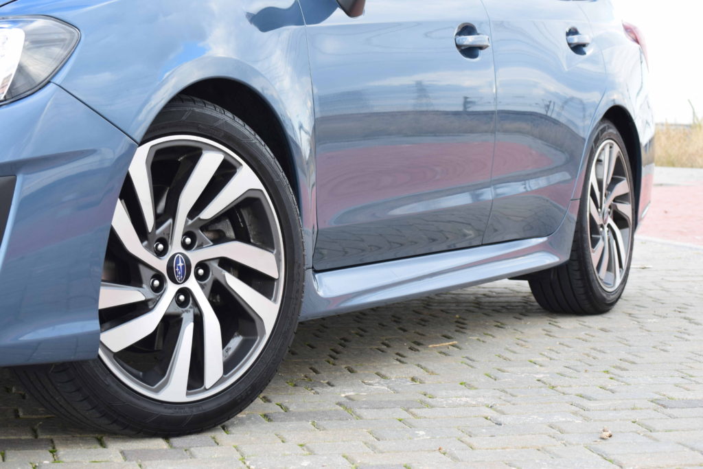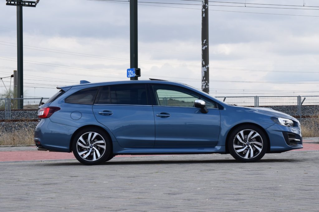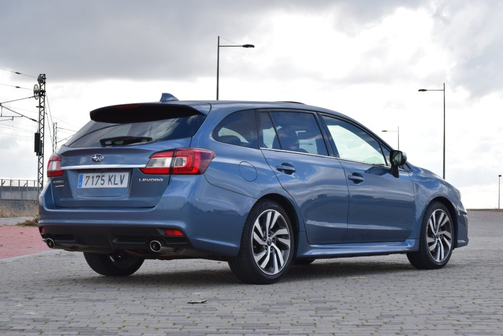 En su lateral destacan las llantas de 18” bicolor, carcasa de espejos en color plata y unas estriberas laterales que sobresalen mucho y le dan una estética muy deportiva al Levorg. La trasera no se queda atrás en deportividad, gracias a un pequeño spoiler, una antena de tipo aleta de tiburón, dos salidas de escape funcionales y unos faros en disposición horizontal donde también se muestra el guiño al motor Boxer en su luz de freno.