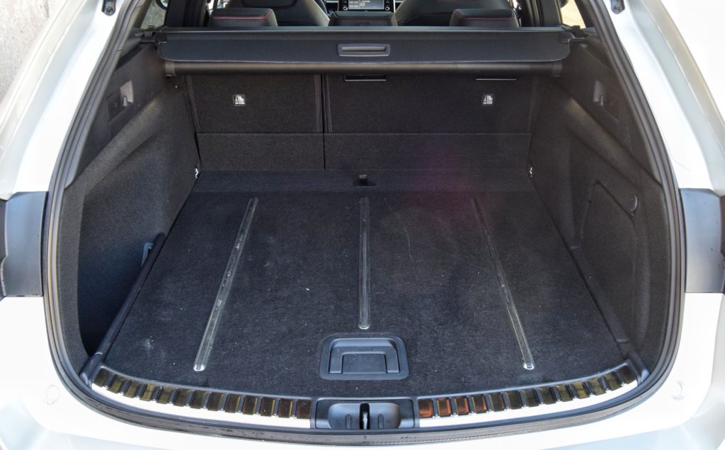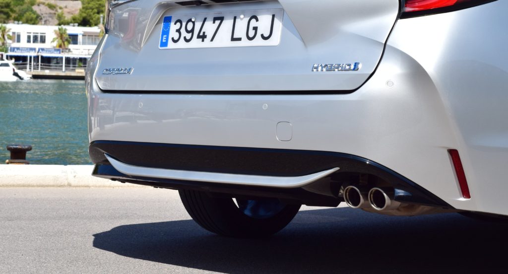 Exteriormente, podemos apreciar la estética agresiva que luce el Corolla en su paragolpes delantero, que no cambia respecto a la versión hatcback. En el lateral es donde se deja ver la longitud propia de un coche familiar, con una altura baja para ir muy aplomado en la carretera y unas llantas cromadas de 18” que combinan perfectamente con el color plata polar de la carrocería. En la trasera vemos unos faros menos agresivos comparados con la versión de 5 puertas y debajo nos sorprende un difusor con colas de escape reales.