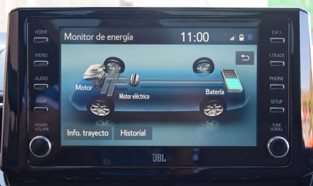 El sistema de infotainment de 8″ mantiene las carencias de otros modelos de Toyota, ya que no dispone de conectividad con Android ni Apple. Integra cámara de visión trasera y menú con los consumos y funcionamiento del sistema híbrido, además de equipo de sonido JBL. Entre otros elementos que encontramos en este interior, destacan el climatizador bizona, cargador por inducción, y la botonería de los modos de conducción y activación del modo eléctrico.