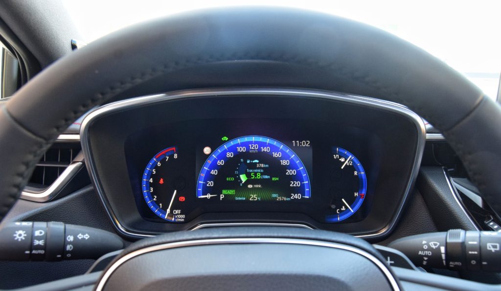 El interior del Corolla TS ofrece lo mismo que sus versiones 5p y sedán: misma calidad de acabados y equipamiento. predominan los plásticos blandos en el salpicadero, los huecos son correctos, y nos acompaña un cuadro de instrumentos con pantalla tft a color de 7″ con información en tiempo real acerca de consumos, potenciómetro y detalles del funcionamiento del sistema híbrido, además de la activación de las diferentes ayudas a la conducción.