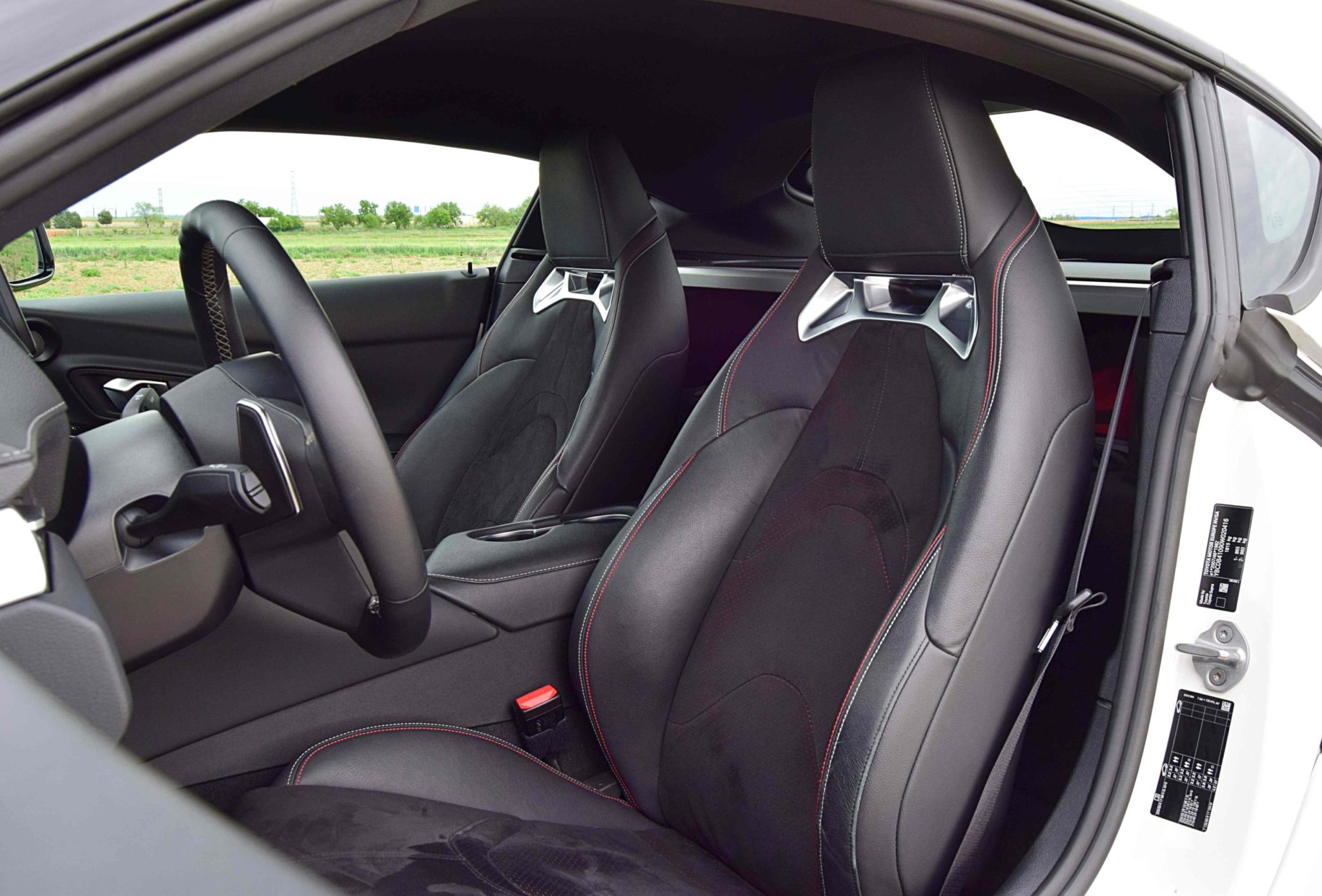 Los frenos actúan de manera sobresaliente sobre los 1570kg que pesa el conjunto. El equipo de frenos Brembo integra discos de 348mm y pinzas de 4 pistones en el eje delantero, y discos de 345mm y pinzas de un único pistón en el eje trasero. El puesto de conducción es muy bajo, típico en un deportivo coupé, y la visibilidad es escasa, aunque es fácil acostumbrarse a este tipo de conducción. En cuanto a ayudas a la conducción, dispone de corrección de volante, aviso de ángulo muerto, aviso de precolisión, control crucero adaptativo, cámara trasera y sensores de parking…