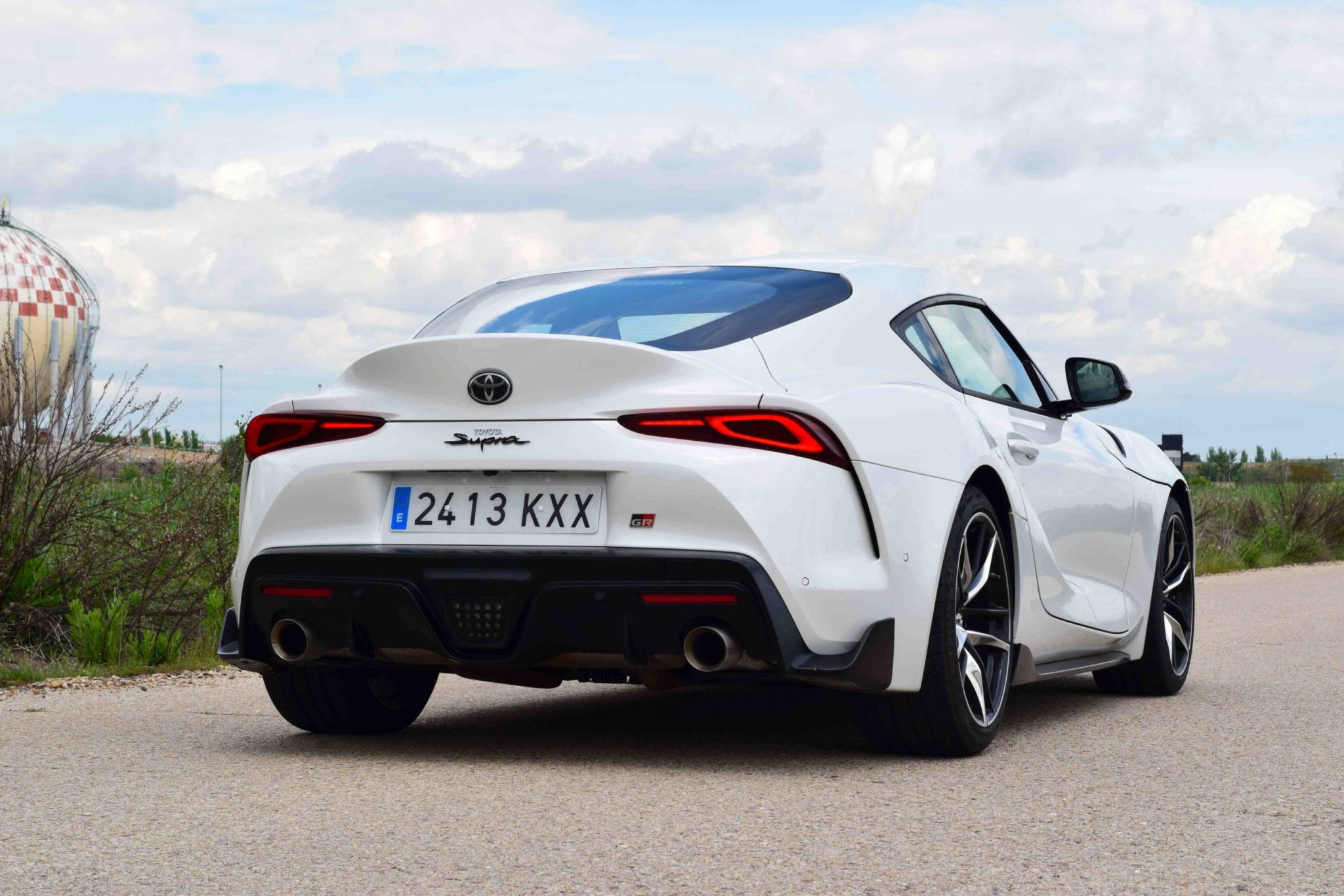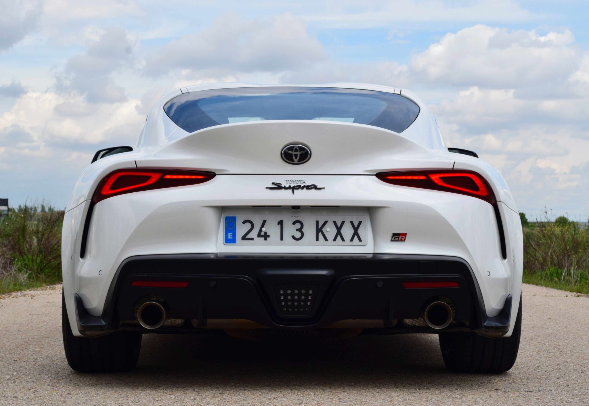 Las llantas, de 19 pulgadas, son forjadas, y montan neumáticos Michelin Pilot Super Sport. En el eje delantero la medida es de 255/35, mientras que en el trasero el ancho aumenta hasta 255. La caída del techo que marca esa silueta súper coupé termina en una cola de pato que hace la función de alerón, que nos guía hasta la fabulosa parte trasera: faros LED que marcan el enorme ancho, logo clásico de Supra junto con el de GR y un enorme difusor negro que integra dos salidas de escape y una luz de antiniebla y marcha atrás en el centro, al estilo coche de rally. Con permiso de Toyota, creo que podemos confirmar que este Supra es un verdadero “culo gordo”.